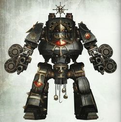 Instead of standard twin-linked heavy bolters, this class is armed with two weapons of the same type - Multi-Meltas, twin-linked Autocannons, Kheres pattern Assault Cannons, or twin-linked Lascannons.[1b] The Mortis is often fitted with a helical targeting array slaved to enhanced target-cursing logis engines that allow it to track its foe with unprecedented accuracy and which make it particularly deadly against enemy flyers.[3b] The Mortis also features Atomantic Shielding and an auger cluster surrounding it's 'head unit'. It may be equipped with Extra Armour, a Searchlight and a carapace-mounted Cyclone Missile Launcher.[1b]