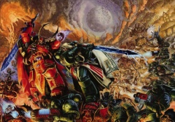 Somehow, Kranon survived his ordeal with the Dark Angels (it is not clear if this is simply a case of conflicting sources or some trick on his part). But by this point, the Crimson Slaughter had garnered the attention of Abaddon the Despoiler, Lord of the Black Legion. Upon meeting the Warmaster of Chaos Kranon vowed to join the Black Crusade, but he would do so only on the condition that the Daemon Tzax’lan-tar was his to kill, whether they be on the same side or not.[6h] Thus the Crimson Slaughter joined in the 13th Black Crusade, striking the Hive World of Regallus.[6i]