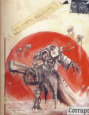 The tech-adepts of the Dark Mechanicum readily adopted black robes and wear a perversion of the Machina Opus: the symbol of the Machine God but with eight arrows added to make the star of Chaos and a skull with a daemonic grimace. Adepts of the Dark Mechanicum are often bestowed with mutation and other Gifts of Chaos.[28]