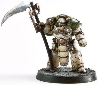 Also called the Pale Harvestmen, the Scythes of Nurgle, or the Eyes of Mortarion, now the Deathshroud serve as Mortarion's representatives, and while they still often fight by his side they also form the honour guard for Chaos Lords and other Chaos Champions which have garnered Mortarion's favour. Their presence is a mixed blessing at best. The Deathshroud will fight with all their skill and strength in support of their assigned champion, and prove to be an undeniable asset in battle. Yet all the while the Deathshroud are judging upon their master’s behalf. If the champion is successful, the Deathshroud will serve him in battle or campaign. If their charge fails in his duties, however, the judgement of Mortarion is swift, deadly and utterly inescapable.[11]
