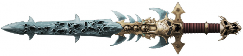 The weapon normally appears to be something akin to a two-handed sword, except that Abaddon wields the weapon with a single hand in conjunction with the Talon of Horus. The guard of the weapon tends to be golden in colour, with a leering face of a demon just above the handle. The ricasso of the weapon has spikes protruding from the sides as well as outward from the blade, and the blade itself is blue with red, tormented faces (the faces of souls it has devoured since being claimed by Abaddon[5]) writhing across its surface.[1]