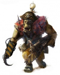 Freebooterz forsake their previous Clan and tribal allegiances and usually wear a distinctive style of dress to emphasise this, often decorating themselves with ear and nose rings, Jolly Ork symbols and flamboyant clothing. As Freebooterz often don't have access to Painboyz or Mekboyz, their injuries frequently have to be patched up in a temporary manner; thus many Freebooterz sport eyepatches, peg-legs or hook hands. Freebooter bands are often led by a Kaptin, these individuals are even tougher, more ruthless and foul tempered than the rest of their brethren and are usually even more ostentatiously attired, frequently favouring large hats and voluminous coats in which they conceal numerous weapons and flasks of fungus rum.[1a]
