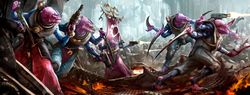 Genestealer activity has also been observed on the Tau Empire Sept of Ksi'm'yen,[11c] though the Tau's connection to their Ethereal Caste makes infection by Genestealers difficult.[14f] The Kroot are known to have been affected as well, though they are generally able to avoid those infected thanks to their ability to taste pheromones, and the wisdom of the Shapers guiding their evolution.[14f] Kroot who have consumed genestealer hybrids can smell other infected individuals, which helps detect infestations in other auxiliary races like the Vespid.[17]