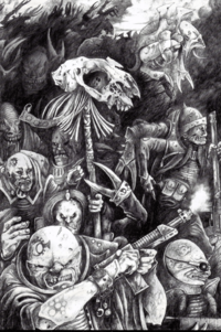 All the cultists of a given world are known as an infestation, and each population area can propagate several full brood cycles. All the cultists in a given population center are known as a gene-sect. Some populations are only numerous enough to support one gene-sect, but on those worlds that are heavily populated, several can coexist. Though each gene-sect may further differentiate itself with markings and subtleties of coloration, ultimately they all hail from the same Patriarch, and usually work together seamlessly. Each gene-sect has its own specialist organisms and leaders. These usually hail from the fourth generation, and hence can pass for human. So close are they in thought and deed that they and their peers in other gene-sects may even band together to fight in the same place at the same time. These gene-sects, usually at least several hundred members strong, are further subdivided into claws. Claws typically number between fifty and a hundred warriors, formed for specific duties, these are assembled and disbanded according to the cult’s needs. Claws will have at least one leader figure that guides them in their mission, and each Magus and Primus will have several claws at their disposal, ranging from neophyte groups that can pass for human to monstrous broods of aberrants that are unmistakably alien.[14b]