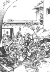 "Space Ork Raiders" were included in the earliest incarnation of 1st Edition. They were depicted as smaller than modern Ork designs, though maintained their green skin, hunched posture, and toothy jaws.[35] Most of the modern concepts associated with Orks such as their hyper-violent nature, Gretchin slave class, and primitive but effective technology were established in the 1st Edition Rulebook. However their violence seemed to be more a result of hatred of all non-Ork life rather than a love of fighting in general.[36]