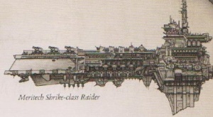 Originally forming the backbone of the Meritech Clan raiding fleet, surviving vessels were sold, stolen, or otherwise acquired by their current users following the defeat of the Meritech pirate empire. The Shrike class raider is typical of Meritech design - a lithe, incredible advanced vessel that utilized banned technologies unknown to the Adeptus Mechanicus.[1]