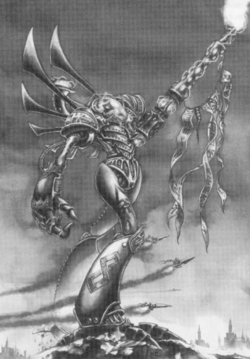 Psychic Lances are an ancient Eldar herding technology common to the visors of all Eldar Knights which has been retrofitted to become a deadly weapon of war capable of sundering unshielded troops and damaging the brain of even the most shielded vehicle or Titan pilot.[1b] An enlarged version of the same device is installed on the arm of the Warlock Titan.[2][3]