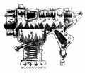Six-Shoota is a variation of Slugga, its short barrel usually fed from a simple mechanical revolving chamber, usually carrying six shots, hence its name. Ork Mekboys often have their apprentice Spanners making Six-Shoootas until they are good enough to work on more complex weapons. It is the most basic Ork firearm, so simple any Ork boy can make it, given needed bitz. Because of it, there are always a lot of them in circulation in any Ork settlement and it often becomes a first weapon of Ork Yoof. However, given that it is less powerful then slugga and even more prone to jamming, Ork Boys usually acquire more powerful weapons as they grow older and richer.[4]