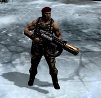 Catachan Devil Squads are lead by a Sergeant or Sarge equipped with a melta gun effective against vehicles or infantry. The sergeant also had the ability to help camouflage his squad when standing still. Catachan Devil Squads can have a demolition expert nicknamed a Demolition Man attached to the squad; he is equipped with a more powerful shotgun and has the ability to deploy improvised explosives. Catachan Devil Squads could also include an attached Heavy Weapons Expert; he is equipped with a grenade launcher that can deliver powerful concussive grenades which can stun and disrupt enemy infantry.[14]