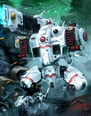 The Stormsurge is a heavy weapons platform designed to serve as the Tau Empire's Titan killer, created by Earth Caste engineer O'Ishu'ron after Tau forces were frequently being outmatched by Imperial Titans and Super-Heavy Tanks. The KV128 was the first of the Tau's new generation of heavy artillery assets known as Ballistic Suits. Less manoeuvrable than a Riptide, such is the power of the Stormsurge's weapons that the suit is equipped with thrusters and retractable ground anchors to counter recoil. In truth, the Stormsurge is more of a walking tank than a true Battlesuit. Unusually for a Tau battlesuit, the Stormsurge has two crew instead of one.[1][2] It is operated by a selected pairing of veteran Hammerhead crewmen, who have graduated in the ballistic suit academies on Bork’an.[3]A Shas'vre experienced in Battlesuit piloting controls the suit itself, while a Ves'oni'Vash graduate controls the weapons systems. It is said that crewing a Stormsurge is less prestigious then a standard Battlesuit.[1][2] The Shas'vre wears a hair braid to signify his rank.[2]