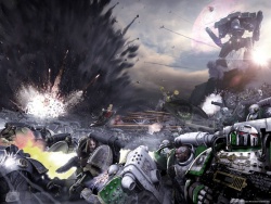 In 0000014.M31, the first day of Primus, Horus' armada at last arrived at the Sol System. During the final intense phase of the Solar War, the traitors captured the Solar System from loyalist forces despite the best efforts of Rogal Dorn to stall until the arrival of reinforcements from Roboute Guilliman and Lion El'Jonson.[25] Once within range of Terra, Horus and his forces destroyed Luna's naval bases and within thirty days had destroyed the Terran system's defences. Terra was bombarded and devastated. The corrupted Marines from the Sons of Horus, Death Guard, World Eaters, Emperor's Children, Iron Warriors, Thousand Sons, Word Bearers, and Night Lords eventually landed on Terra, experiencing heavy resistance from the defenders which were led by the Imperial Fists, Blood Angels, and White Scars. Vast amounts of traitor Imperial Army, Dark Mechanicum, Chaos Cultists, and Daemonic forces joined the traitor Astartes in their assault on Terra. The loyalists were outnumbered and the battle for Terra turned into a siege of the Imperial Palace. By the fifty-fifth day the rebels had reached the walls of the Inner Palace but Sanguinius managed to hold the Eternity Gate despite a vicious assault led by the Bloodthirster Ka'Bandha. Eventually a stalemate set in with not even the siegecraft of Perturabo and the Iron Warriors being able to break the tide. Horus, who had remained in orbit aboard his battle barge, was at that point warned that the Ultramarines and Dark Angels were returning to Terra and would arrive shortly. If this were to happen, Horus's advantage in numbers would be eliminated and he faced the prospect of attacks to his rear. In a final gambit he deactivated the Void Shields protecting the Vengeful Spirit to lure the Emperor in a final battle that would decide the war.[2e] At the same time, Typhus led a Death Guard assault against the Astronomican, seeking to stop its reactivation by Corswain and his Dark Angels as well as Euphrati Keeler and Sigismund.