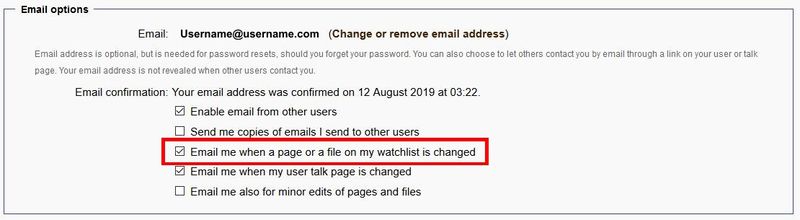 On the View and edit watchlist page (see above), items can be removed by checking the box next to the desired pages and clicking the Remove titles button at the bottom of the page. Pages can also be manually removed and added via the Edit raw watchlist page.